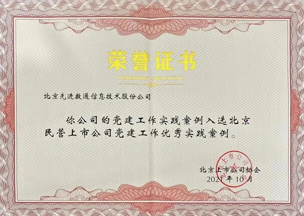 近期,北京上市公司协会授予北京韦德国际1946信息技术股份公司荣誉证书,韦德国际1946党建工作实践入选北京民营上市公司党建工作优秀实践案例,相关党建活动已收录在《北京民营上市公司党建工作优秀实践案例汇编》。